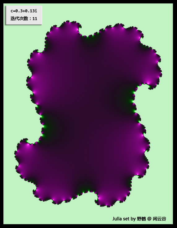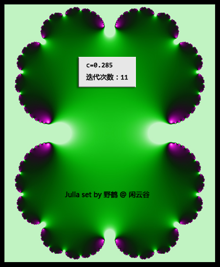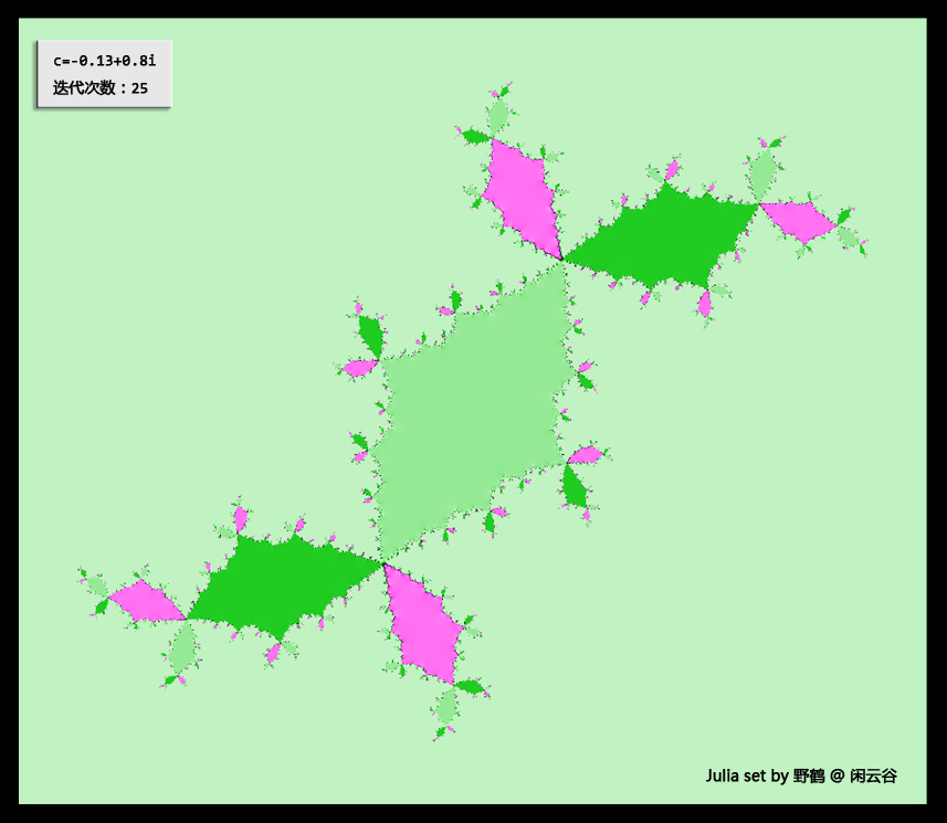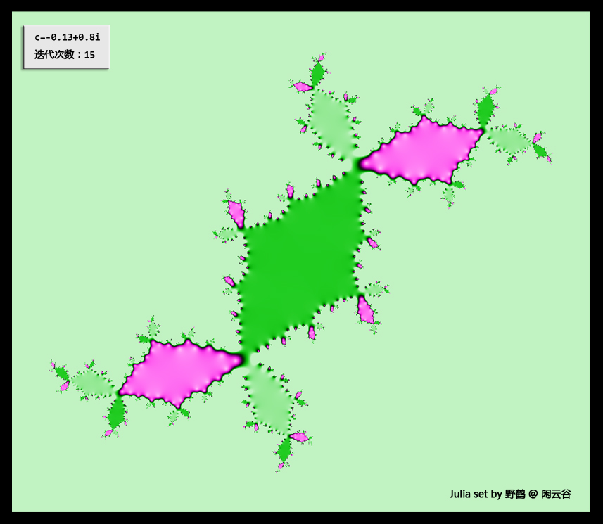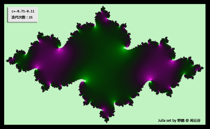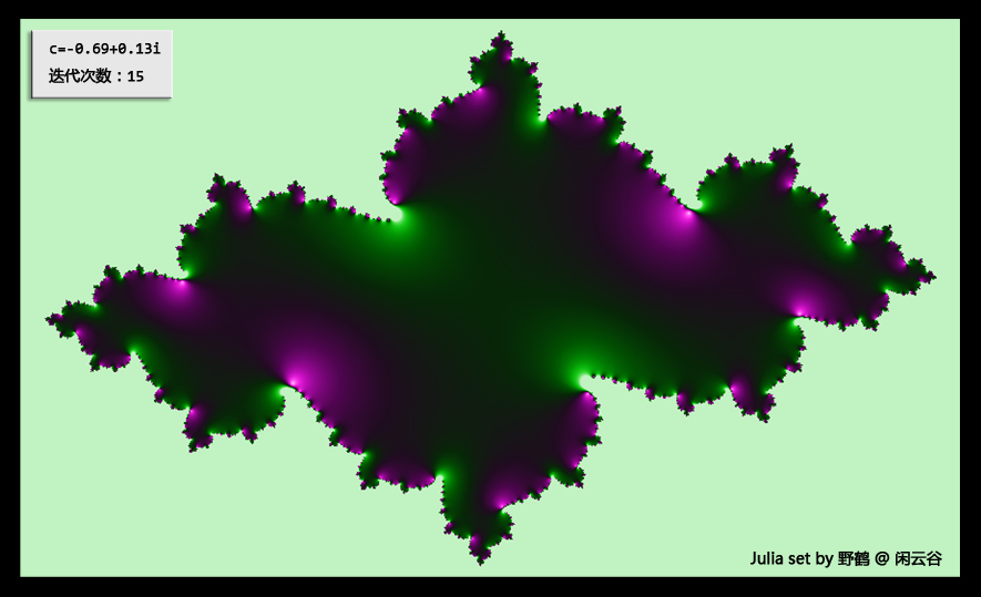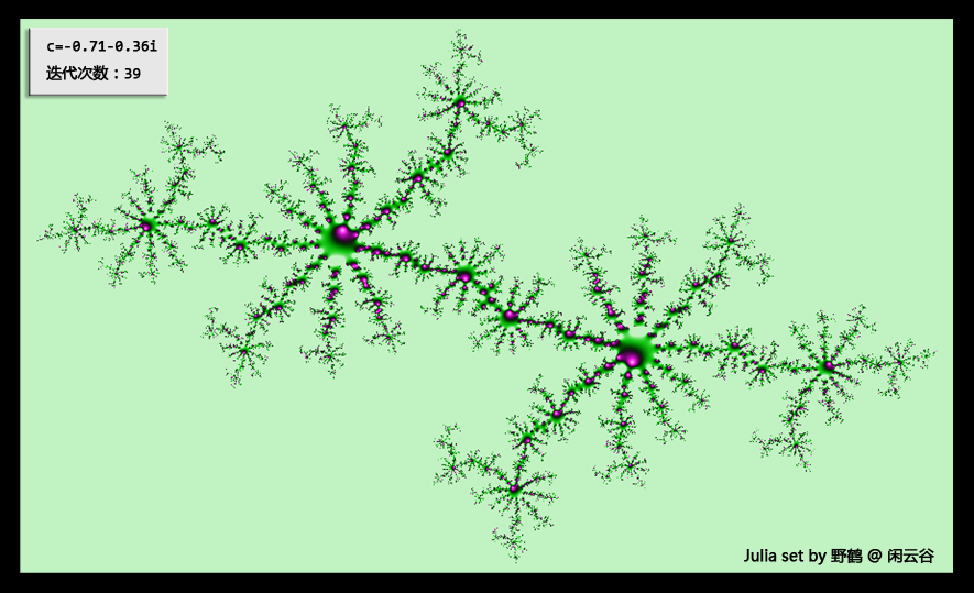。同时,它们之前也有深刻的联系,比如,只有当$c\in M$时,$J$才非空。 上面的介绍,实际上恰好给计算机绘制分形图案提供了一个方法——将复平面上的点按发散或收敛速度定义颜色。构造分形有四种常见的方法,逃逸时间分形、迭代函数系统、随机分形、奇异吸引子。这里介绍的方法属于逃逸时间分形方法。下面是一些朱利亚集的一些例子。