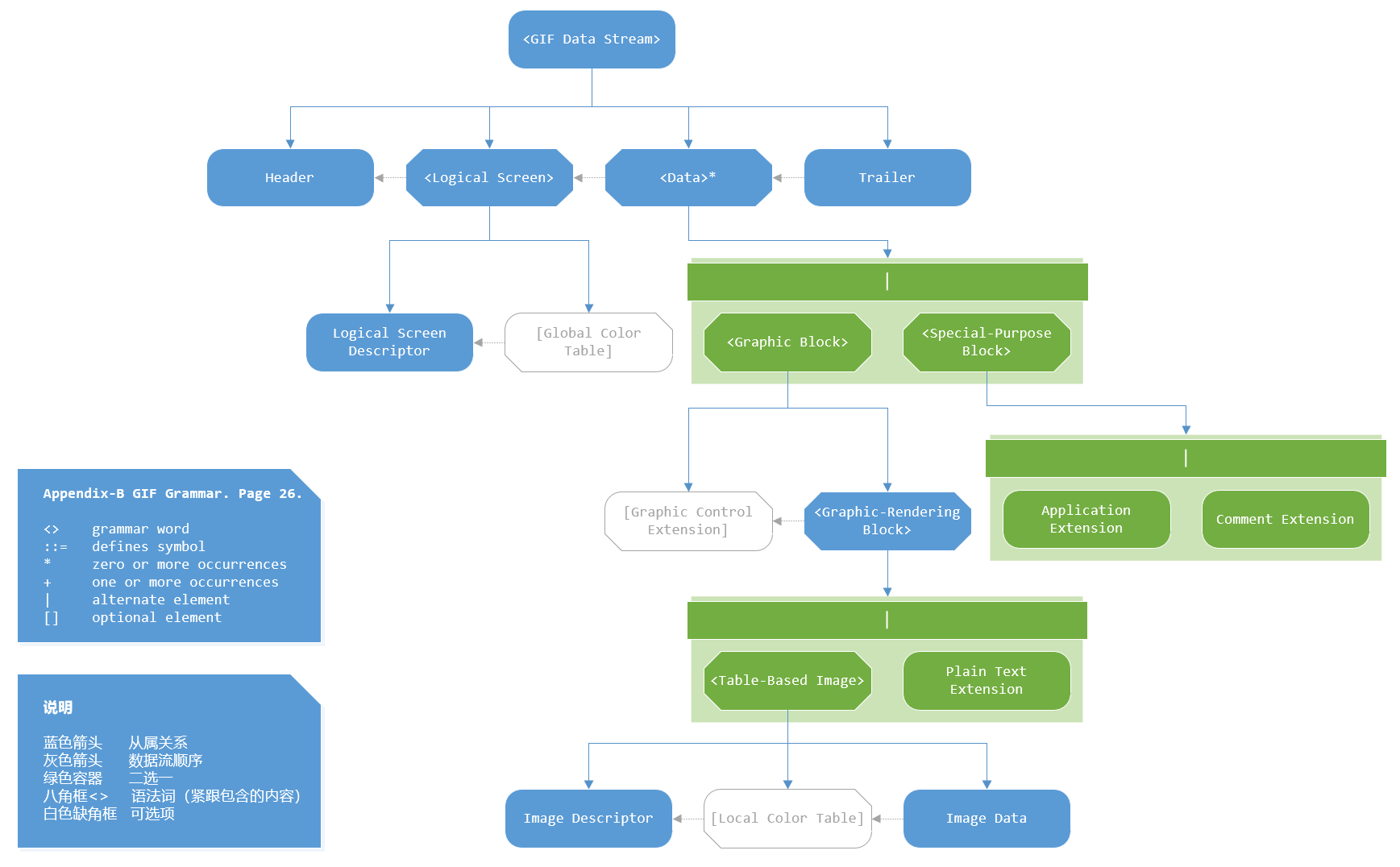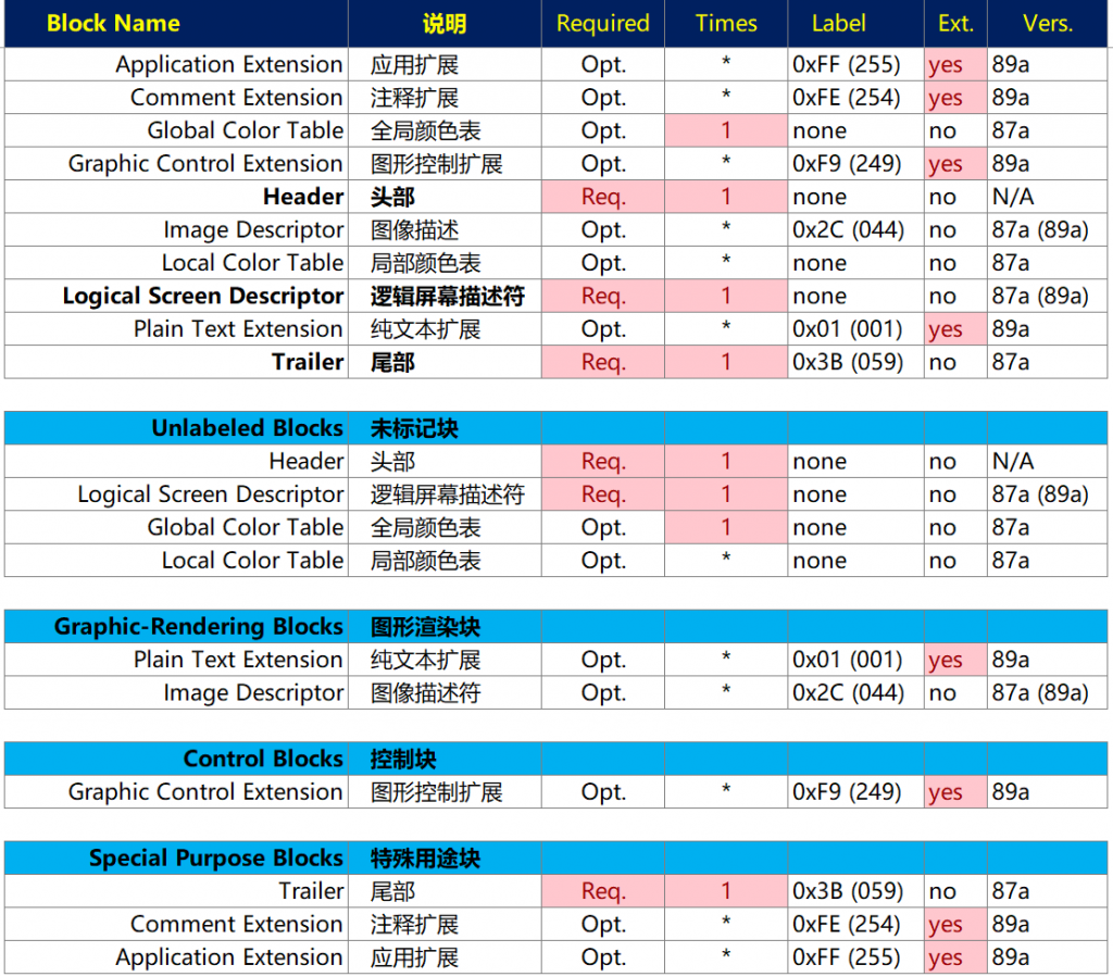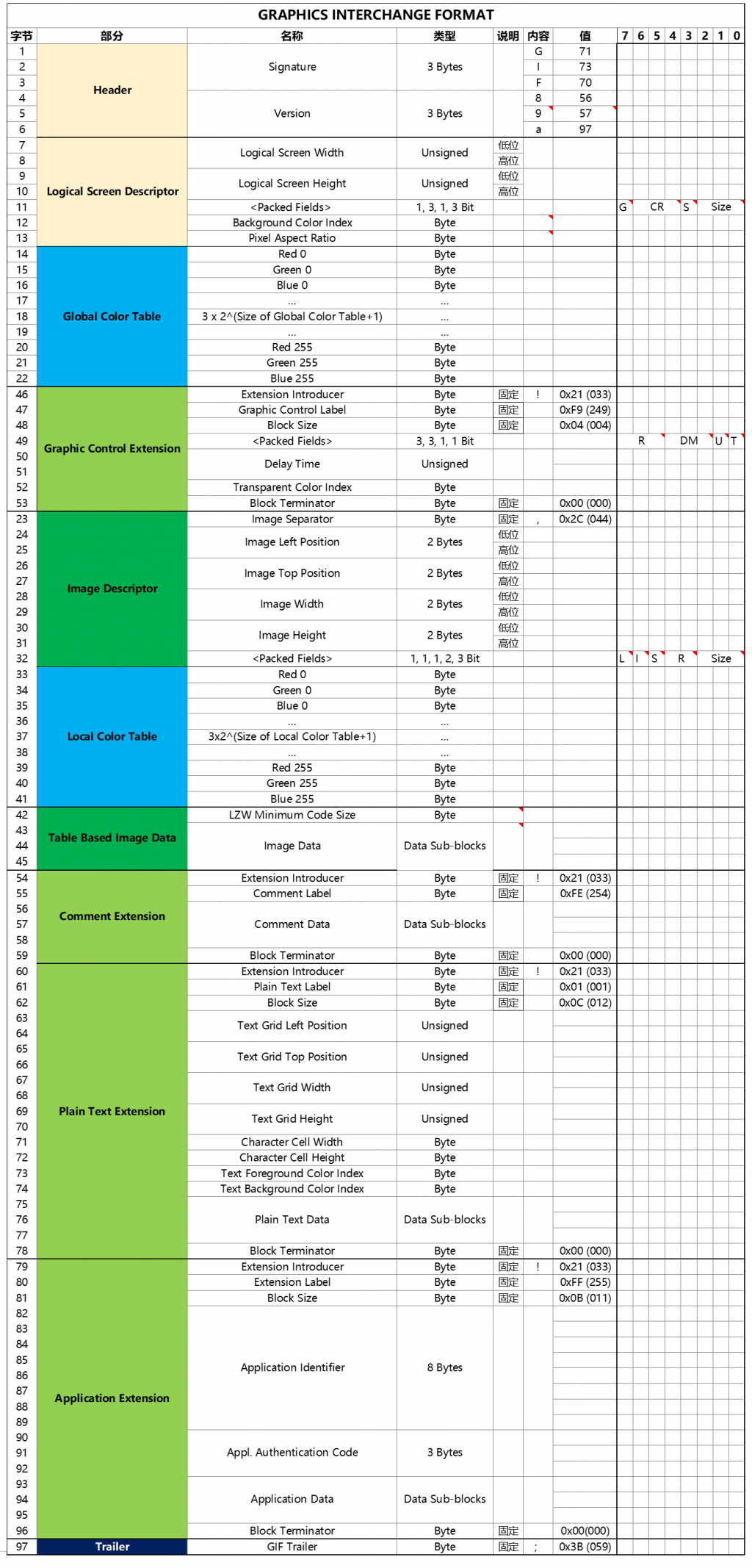 根据《GRAPHICS INTERCHANGE FORMAT(sm) Version 89a》,整理得到如下GIF文件格式结构简图: