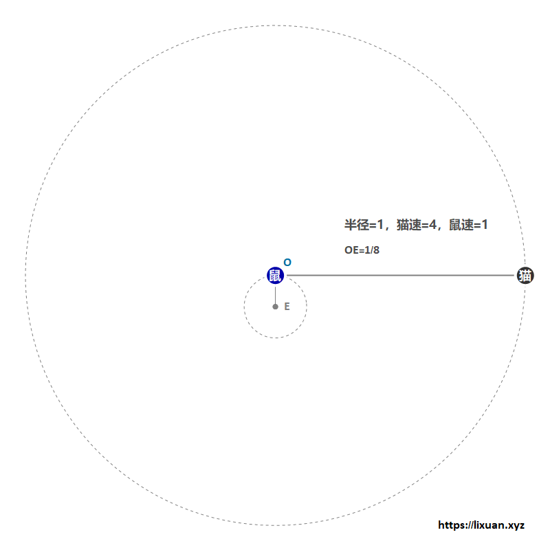 • 第一步:老鼠保持与猫和圆心三点共线(圆心在两者中间,前面说过当老鼠在距离圆心$R/4$的圆形区域内时是可以办到的)全速远离圆心;
