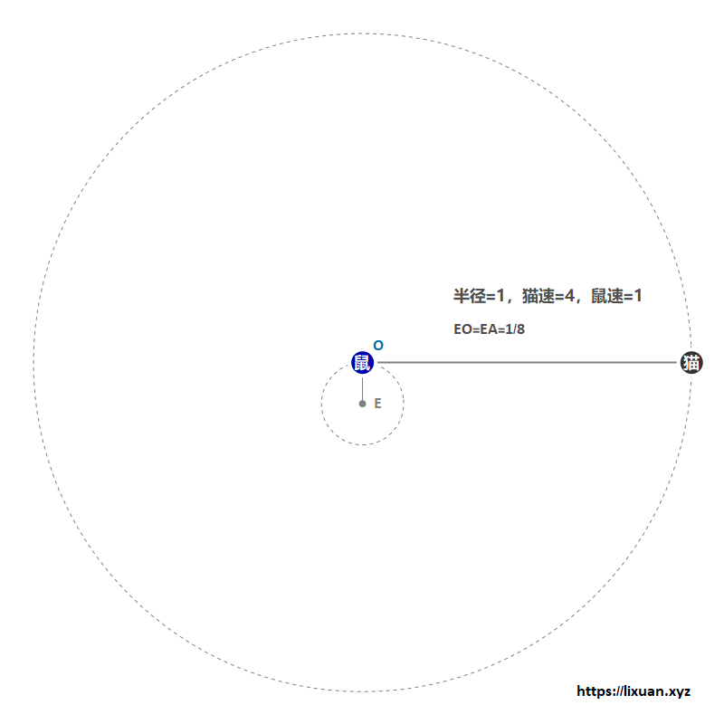 已知两者速度的关系为:$v_\text{猫}=4v_\text{鼠}$(老鼠的最大速度是猫的四分之一)。