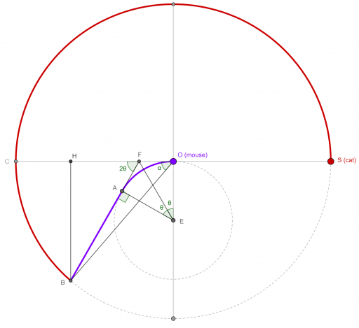 设$\angle OEA=2\theta$是老鼠在圆弧阶段游过的角度(显然$0<\theta<\frac{\pi}{2}$,后面化简用到时不再赘述),则有$\angle BFC=\angle OEA=2\theta$(同角的补角相等),连结EF,则有$\triangle EFA \cong \triangle EFO$。