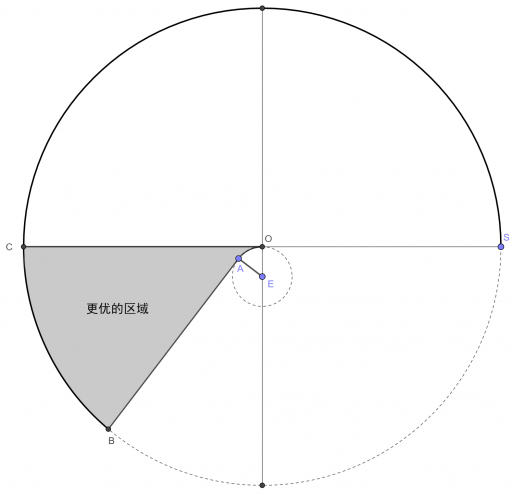 如下图所示,还是在假定猫优先逆时针追逐老鼠,那么老鼠在时间上比方法三更优的路线必然在灰色的“更优区域”内,而且猫和老鼠同时到达岸边的位置$B’$也必然在弧$\overset{\frown}{BC}$上,同时老鼠为了节约时间,所以其最初的路线必然会在圆E上,然后沿切线游到点$B’$。这样一来,不正是方法三的思路么,而方法三计算的就是这个思路的最优路径呀。所以,我猜方法三已经是该问题在时间上的最优解了。